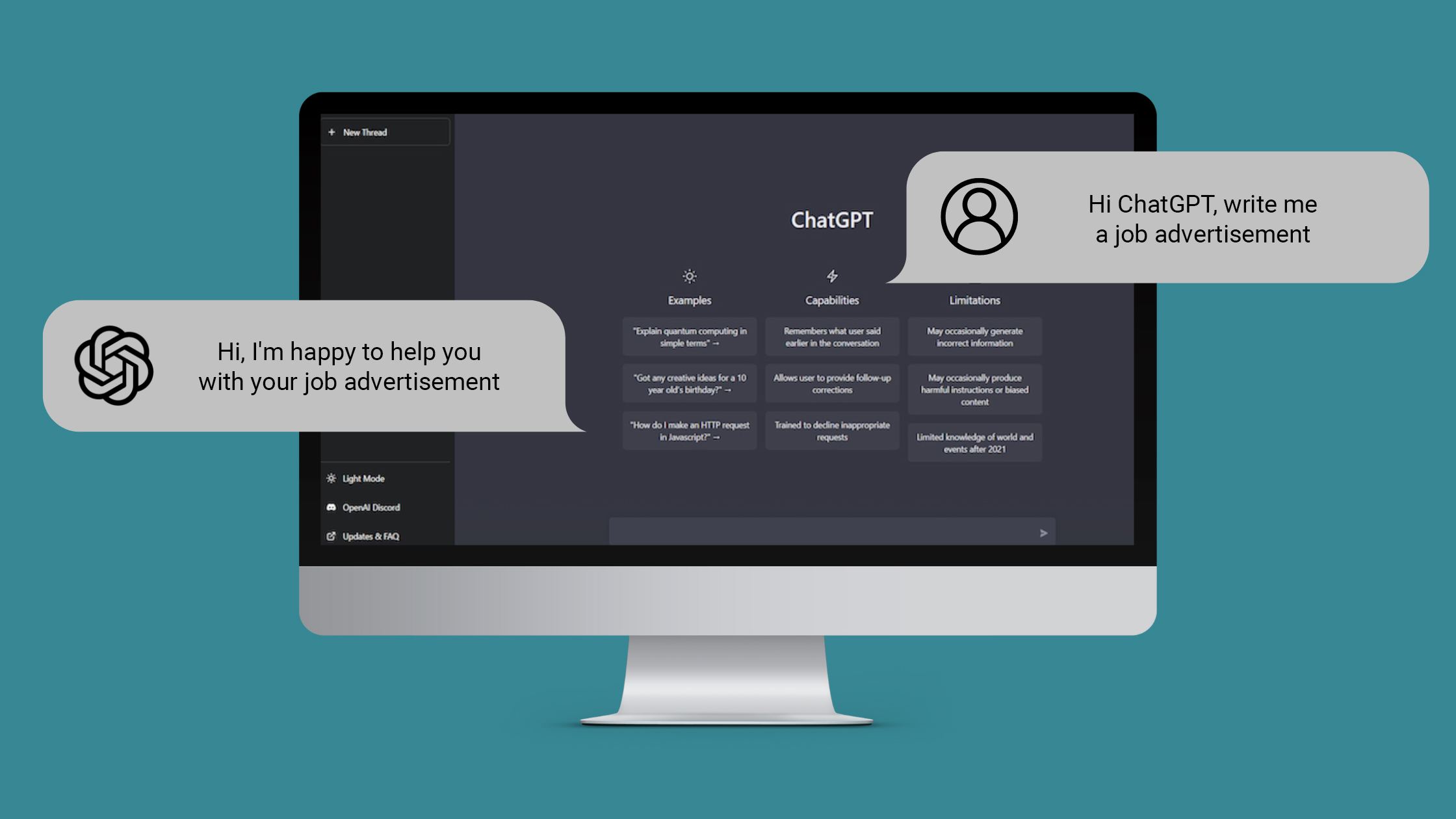 This opens up a number of possibilities for ChatGPT to simplify the work of recruiters. Processes can be made more efficient, enabling enormous time savings and support from the chatbot. This can be a decisive advantage in recruiting in particular, as applicants can be given faster feedback and the risk of them already progressing in other application processes while their applications are still being processed in your own company is reduced. This relieves recruiters of comparatively unpleasant tasks and gives them more freedom for creative and interpersonal tasks. In addition, ChatGPT can be used to gain inspiration for certain aspects and improve content by quickly gathering ideas and suggestions.